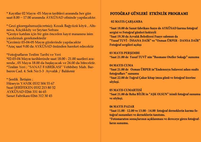 Fotoğraf dia gösterileri yapılacaktır. Ayrıntılı program daha sonra duyurulacaktır.